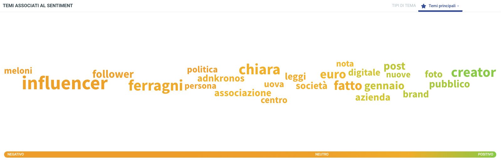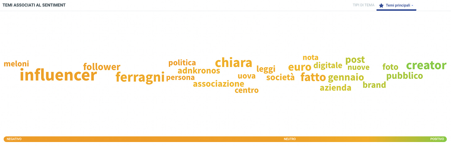 Tutto uguale quindi? Non proprio. Il Pandoro Gate e tutto quello seguito ha toccato comunque delle corde. Una su tutte la crescente rilevanza dei creator rispetto agli influencer tradizionali, ovvero la valenza del contenuto VS visibilità. Analizzando le conversazioni sul topic influencer durante la crisi ci accorgiamo come INFLUENCER sia un termine dal sentiment fortemente negativo, mentre invece CREATOR sia uno di quelli con la miglior percezione. Non un caso.