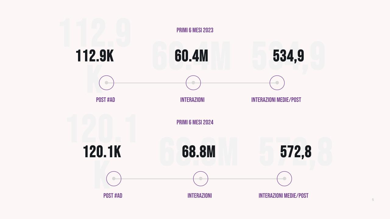 Paragonando le attivazioni #ad su Instagram dei primi sei mesi del 2023 a quelle del 2024 vediamo un aumento: si passa infatti da 112.9mila contenuti a 120.1mila (+6,3%). Ma ad aumentare non solo solo le attivazioni, ma anche le interazioni a conferma che nulla (o poco) è cambiato non solo per i brand, lato fiducia, ma soprattutto negli utenti: da 60.4 a 68.8 milioni (+13,9%).