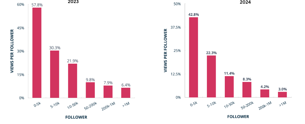 Il confronto del rapporto follower/views di TikTok nel 2023 e 2024 fatto da RivalIQ è eloquente in questo senso.