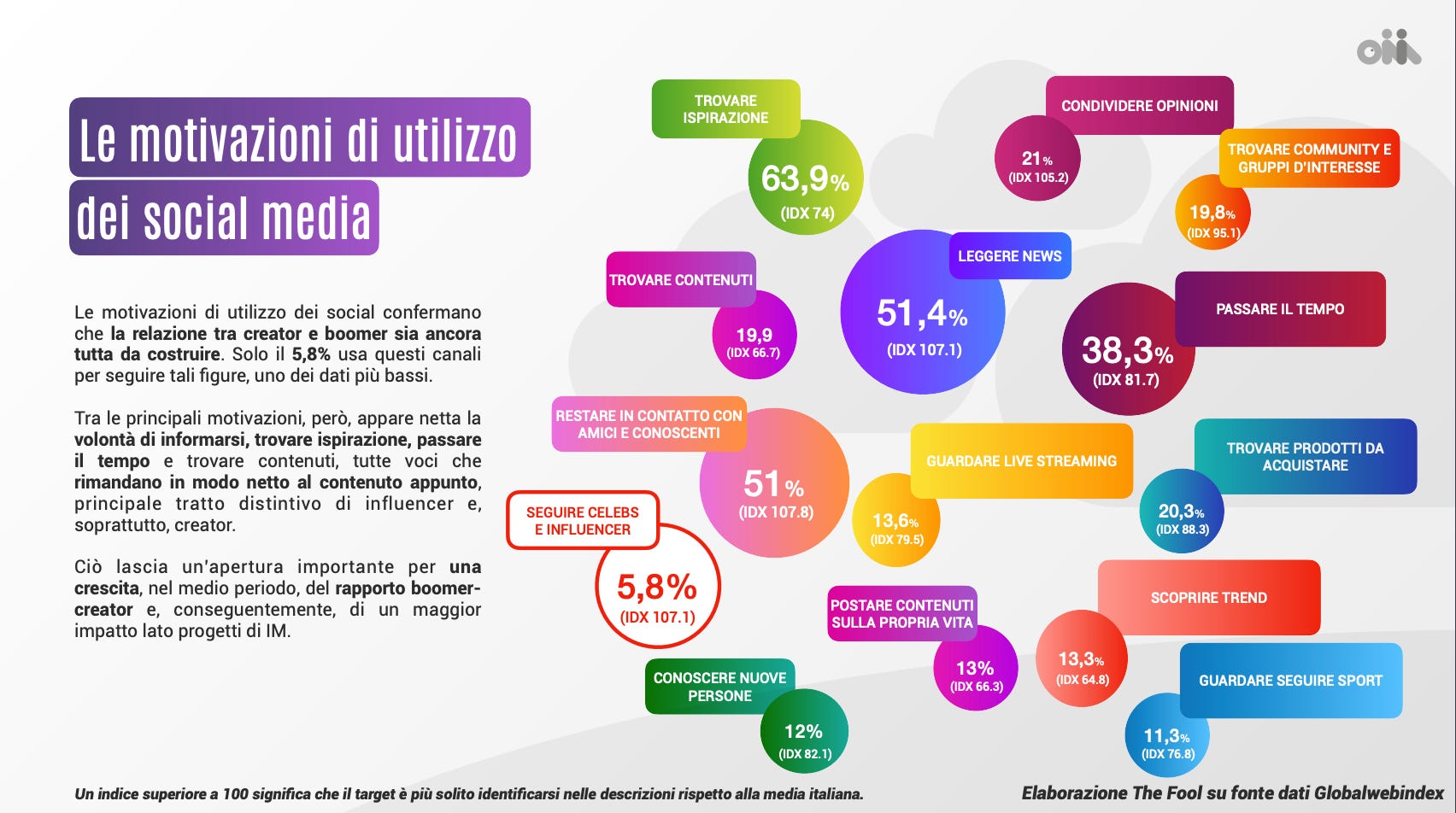 I motivi di utilizzo dei social media dei baby boomer italiani - Elaborazione ONIM su dati Globalwebindex